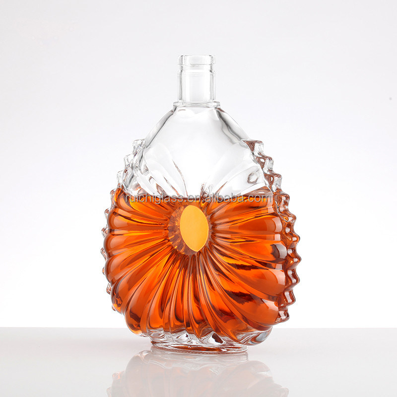 Estilo más popular botellas de vidrio de brandy de lujo en relieve botella de whisky de vodka de lujo